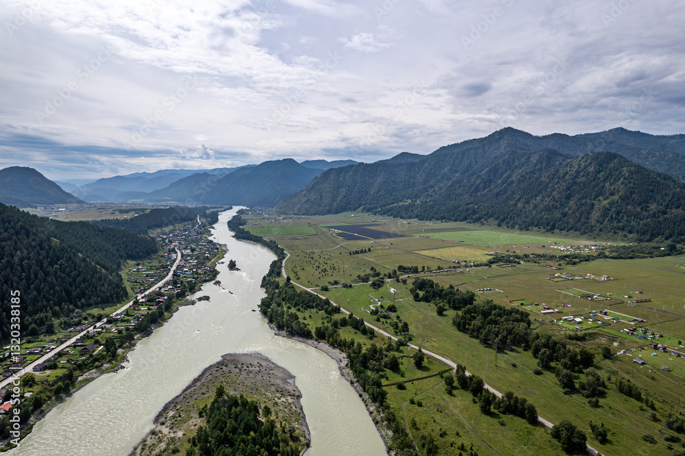 Panorama of mountain summer landscape of fast river Katun, Altai mountains, Russia.