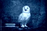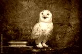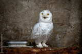 White polar owl with surprised face breathes like a dog moving tongue with open beak. Night bird of prey close-up. Animal behavior habits.
