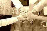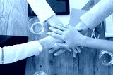 Praca zespołowa, sukces w biznesie. Dłonie czterech osób w geście sukcesu, zwycięstwa