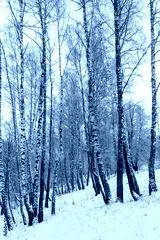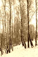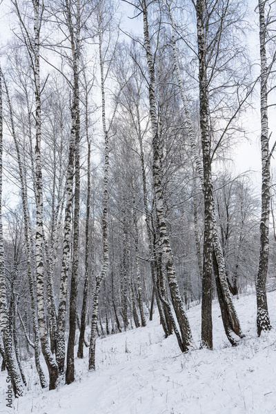 Birch grove after a snowfall on a winter cloudy day. Birch branches covered with snow.