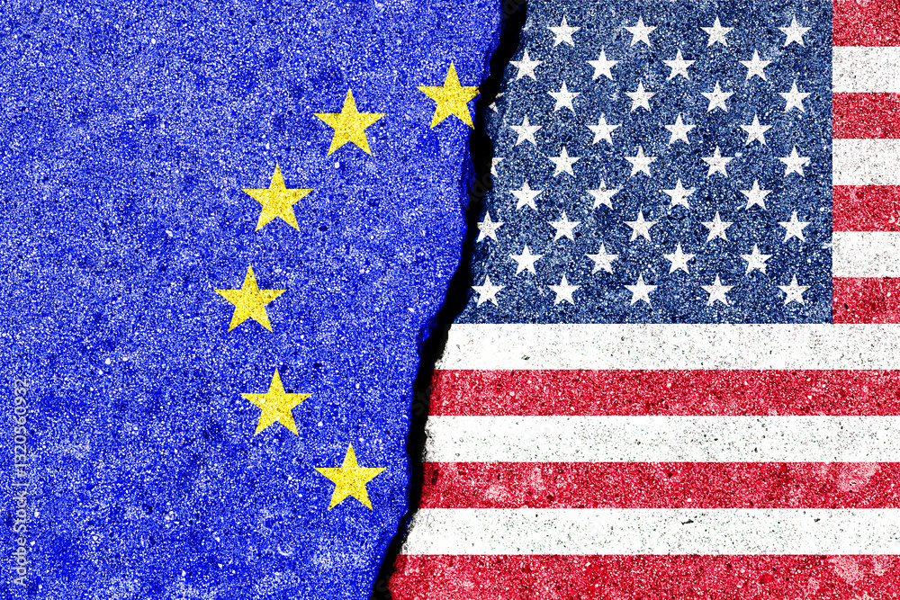 The crack between the flags of the United States and the European Union. The concept of problems in the relations of countries and trade tariffs.