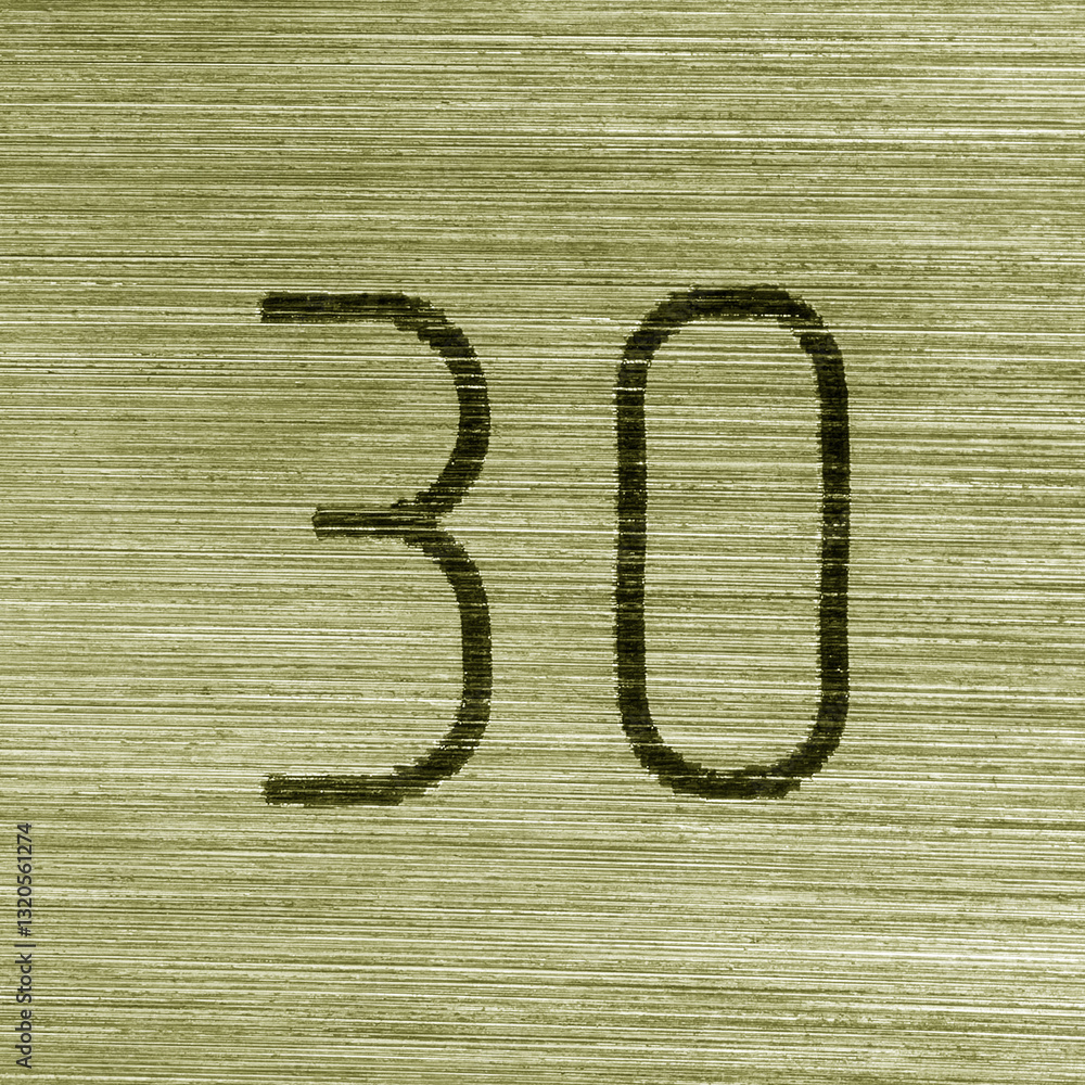 Scratched golden numbers 30 or thirty on a piece metallic panel. Abstarct numeral background.