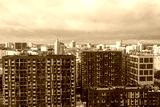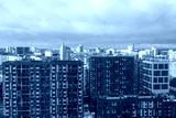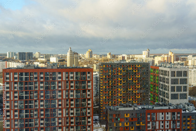 Modern apartment buildings with colorful facades and cityscape in daylight.