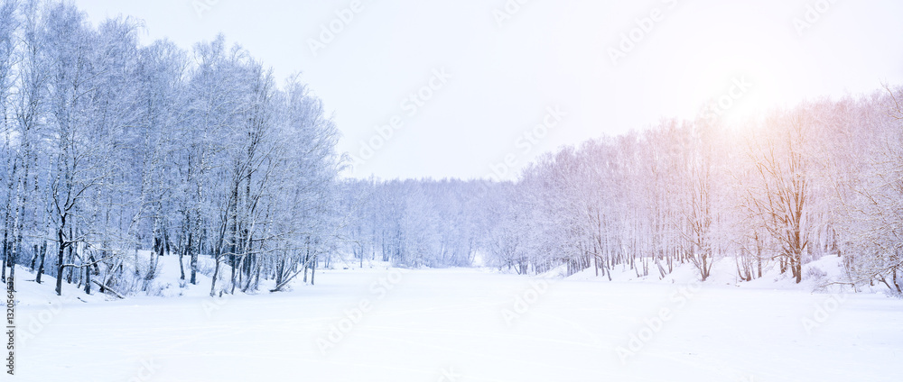 A birch grove after a snowfall on a winter near a frozen lake. Sunlight breaking through the clouds. Panorama.