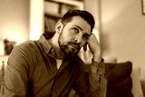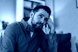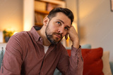 A man sits on a couch with a thoughtful expression. The scene has a relaxed atmosphere with soft lighting and a modern interior. Concept of deep thinking, decision-making, or introspection.