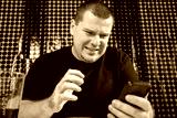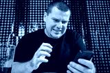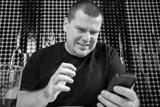Man looks at phone screen with disgust, facial expression of disbelief, sitting at home with a smartphone.