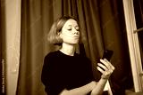 Angry woman with phone at home, sitting casually in a reflective mood, showing annoyance and loneliness.