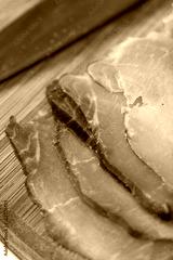 Flat lay sliced smoked sirloin on the wooden board with copy spa