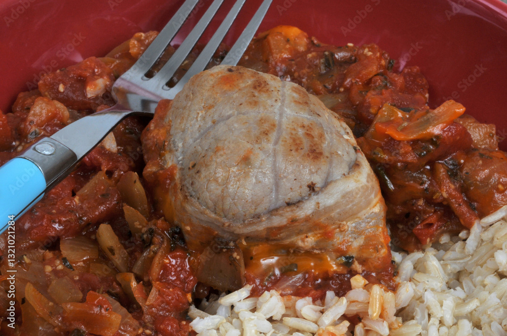 Paupiette de veau avec du riz accompagnée d'une compotée de poivrons et tomates servie dans une assiette avec une fourchette en gros plan
