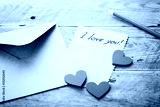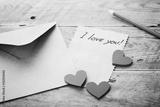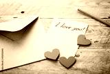 Envelope or letter, red hearts and notes I love you on vintage wooden table for Valentines Day in retro toning.