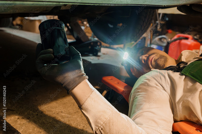 Mechanic wearing headlamp inspecting oil filter under vehicle in auto repair garage
