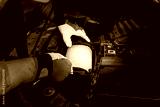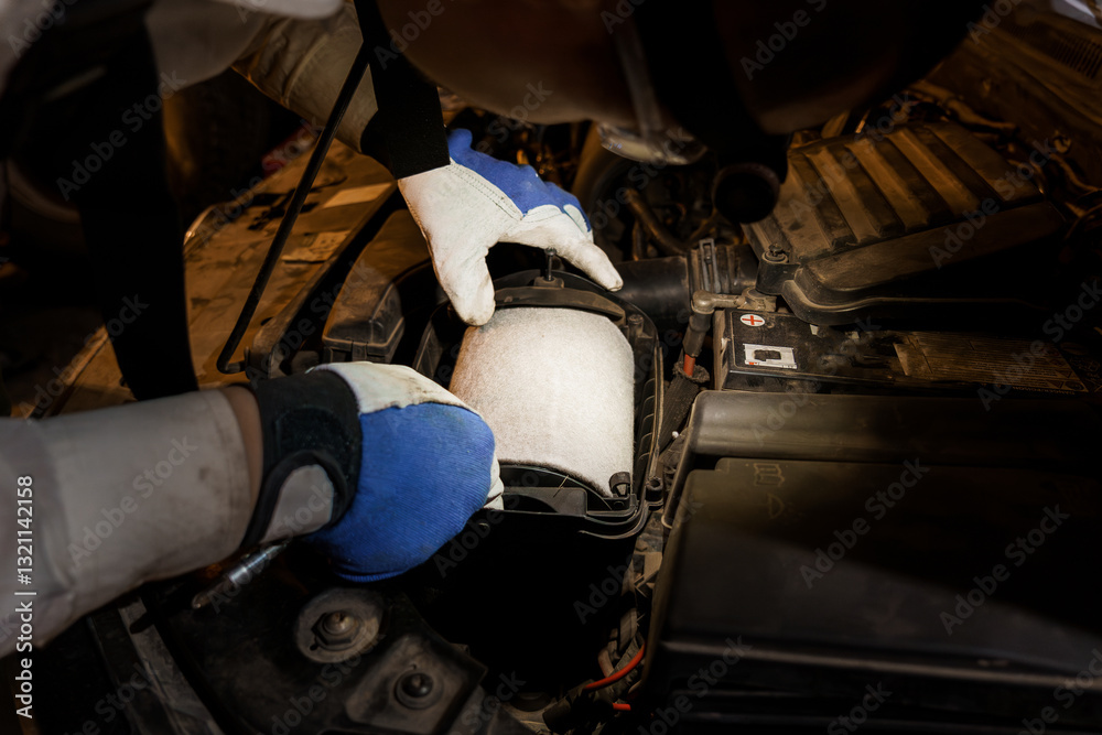 Close-up of a Mechanic Wearing Gloves Replacing an Air Filter in a Vehicle Engine Compartment