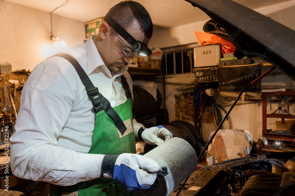 Focused Professional Mechanic Inspecting and Repairing Vehicle in Well-equipped Garage Workshop