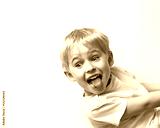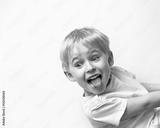 little boy teasing, showing tongue and makes a face, on white ba