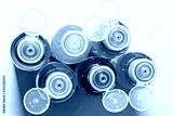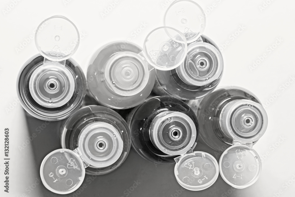 colored bottles for cosmetics, cosmetics and shampoos, top view