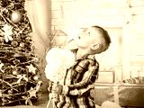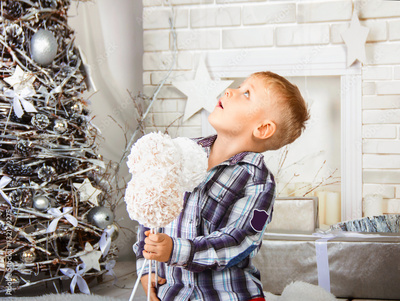Portrait of a cute little baby boy cheerful among Christmas deco