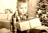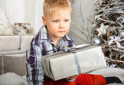Portrait of a cute little baby boy cheerful among Christmas deco