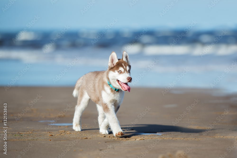 adorable siberian husky puppy walking by the sea