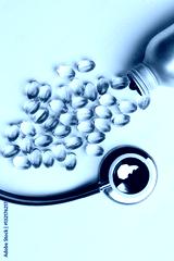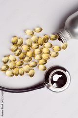 Fish oil capsules in bottle with stethoscope isolate on white background.Fish oil supplement capsule source of omega 3 ..
