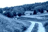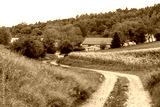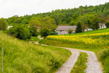 Wioska w dolinie, majowe popołudnie - kwitnący rzepak na polu.Wieś w malowniczej dolinie w majowym rozkwicie natury, w oddali widać domy i zabudowania gospodarcze. Piękny, bogaty przyrodniczo obszar