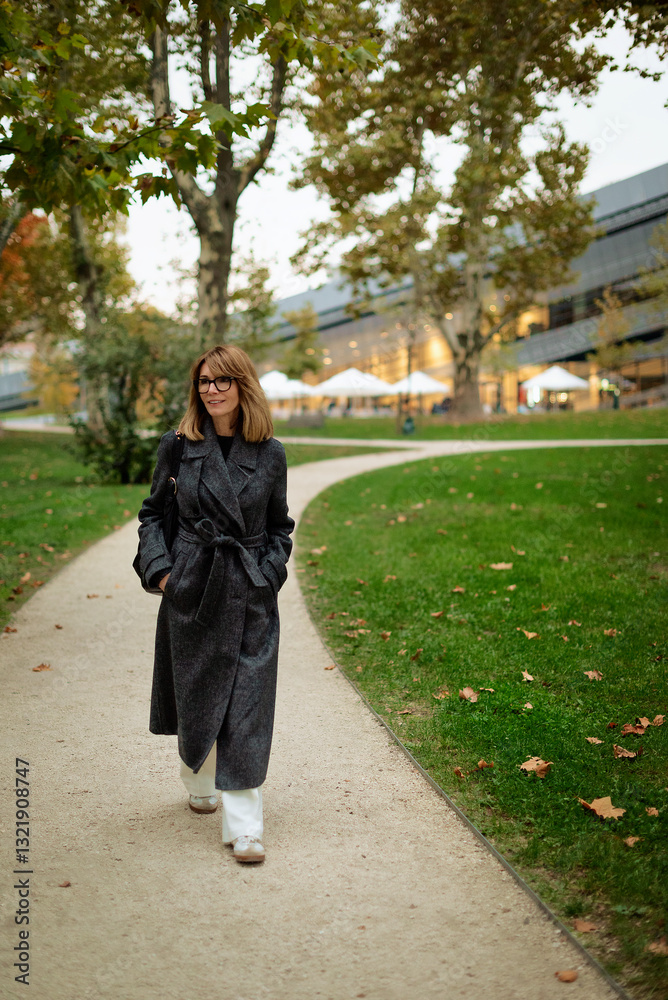 Blond haired woman walking in the city in an autumn day