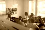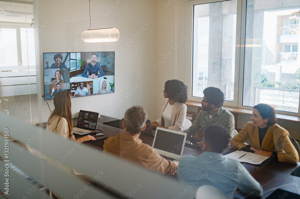 Business professionals engaged in a video conference meeting with remote colleagues. A dynamic corporate environment focused on digital collaboration and strategic planning.