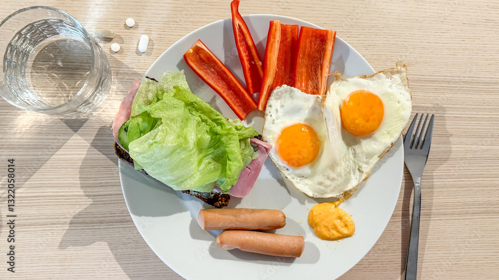 Healthy breakfast plate with eggs, sausages, red peppers, lettuce, and supplements, nutrition, wellness