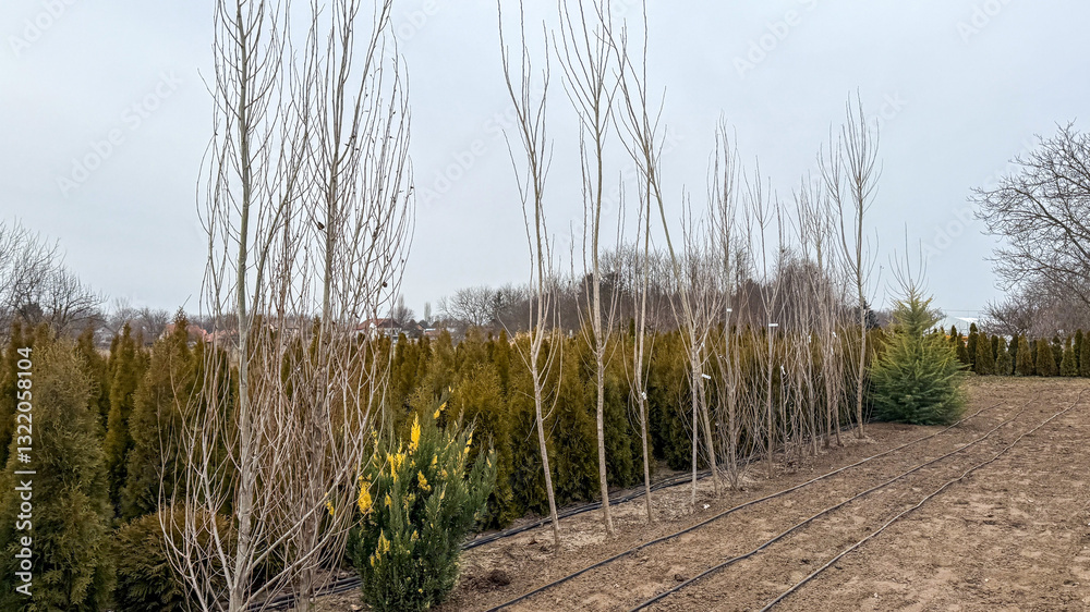 Bare trees and evergreens in a winter landscape, nature serenity, seasonal change, countryside calm