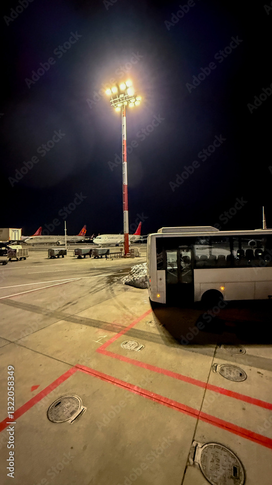 Airport tarmac at night with parked bus under bright lights, travel transportation, night journey scene