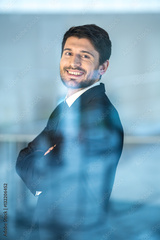 The smile businessman stand and cross hands near the window