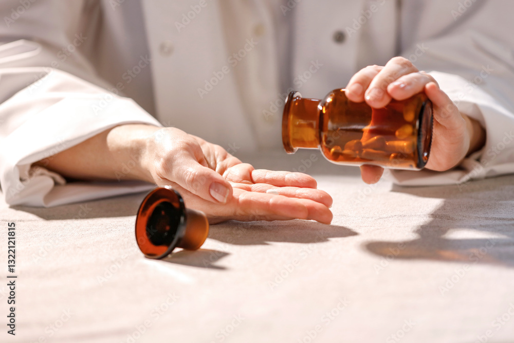 Doctor or pharmacist holding a dark glass medicine container with pills and pouring them out of glass bottle on a hand. Copy space for text or products.