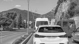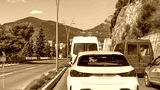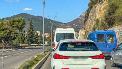 Traffic jam on a scenic mountain road, road trip adventure, travel delays, sunny day journey
