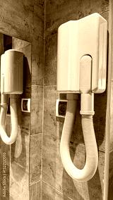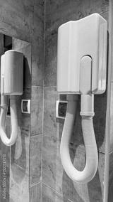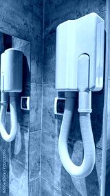 Electric hand dryer with hose on a tiled wall, bathroom hygiene, modern home appliance design