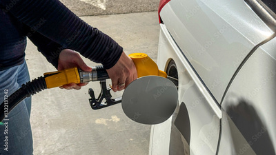 Close-up of person refueling white car, eco-friendly travel, transportation, energy efficiency, fuel station concept