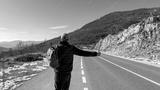 A man hitchhiking on a scenic mountain road with a blue backpack, adventure travel concept