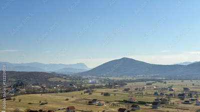 Scenic rural mountain landscape under clear blue sky, ideal for travel, nature retreats, panoramic views