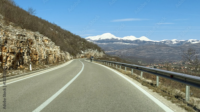 Open road leading to snow-capped mountains under blue sky, travel adventure, nature exploration, scenic journey