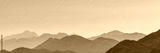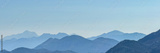 Peaceful blue mountain range landscape at sunrise, serene nature, tranquil hiking destination, scenic outdoor adventure