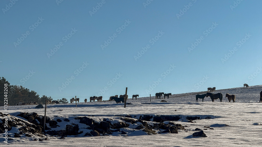 Horses grazing on a snowy hillside under a clear blue sky, winter tranquility, nature retreat