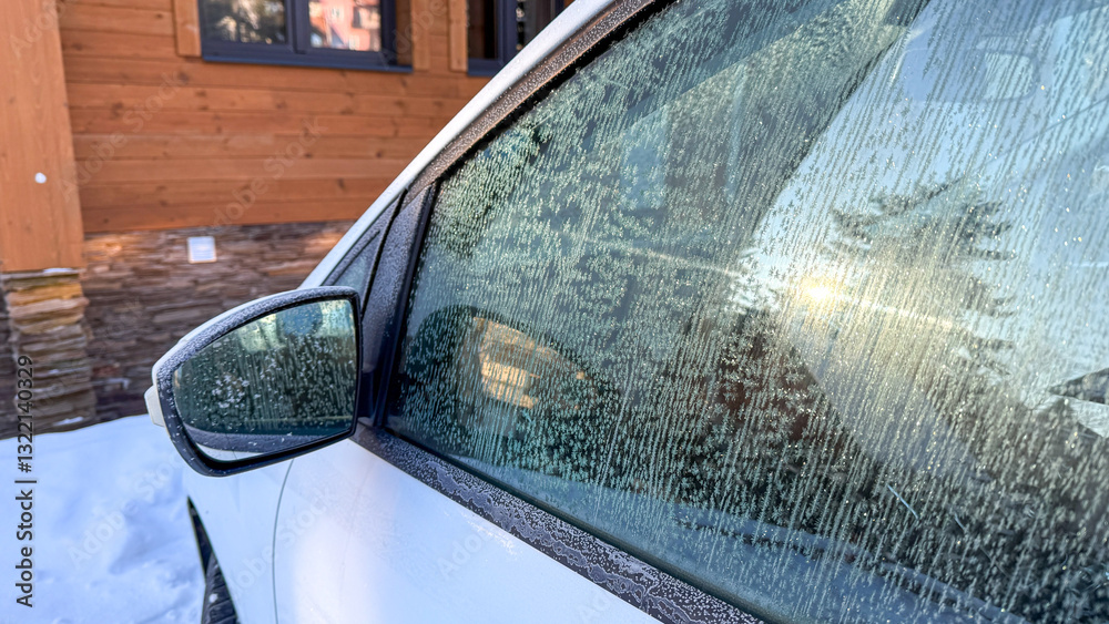 Frost-covered white car window depicting winter chill and holiday travel, icy weather concept