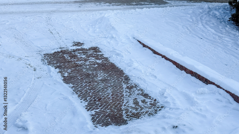 A snow-covered brick pathway partially cleared, winter maintenance concept, serene snowy walkway, seasonal landscape
