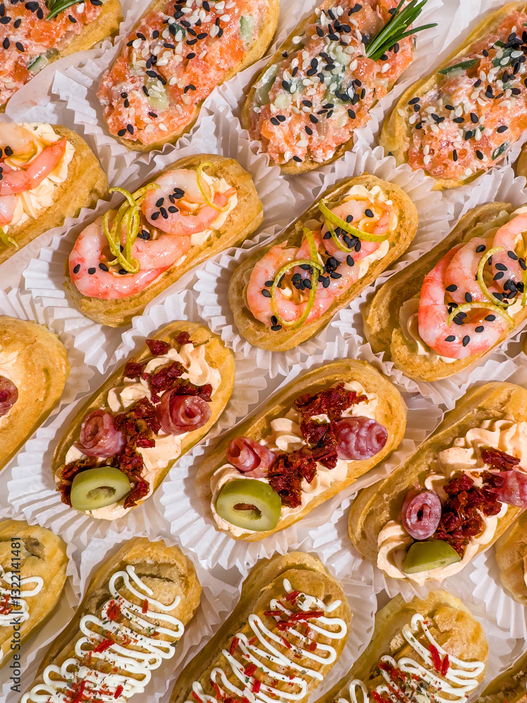 Assorted gourmet eclairs with diverse toppings, perfect for celebrations, dessert elegance, artisan pastry details