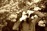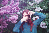 Teenage girl with red hair wearing glasses and blue blouse making a frame with her hands in front of blooming lilac bushes. Outdoor portrait photography