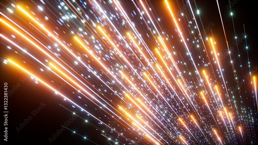 3d render, abstract background of yellow and blue neon lines glowing in the dark. Fireworks and bokeh lights. Data transfer concept. Digital futuristic wallpaper