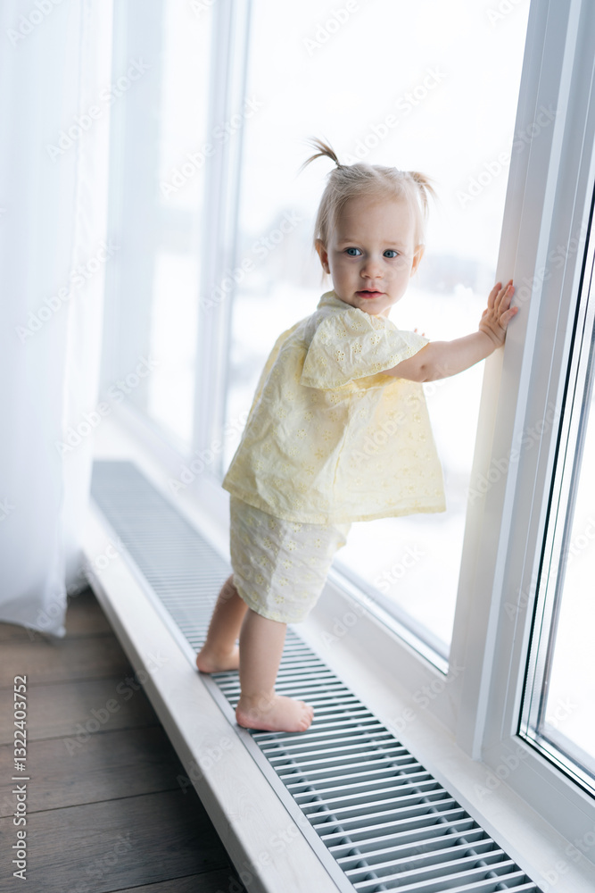 Vertical portrait of curious toddler girl with two playful ponytails standing by window on windowsill, soaking in winter scenery enjoying cozy warmth of home. Charming scene of childhood innocence.