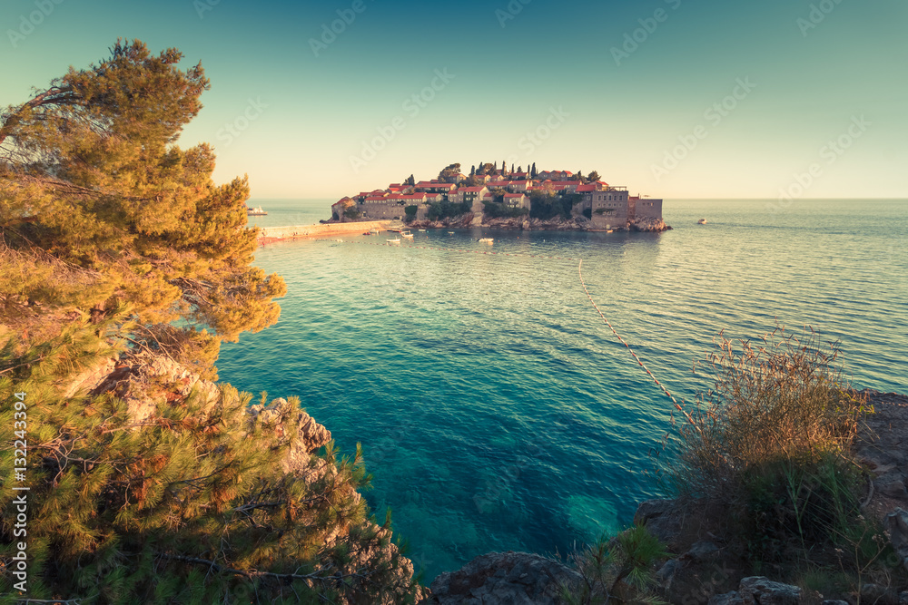 View in the Adriatic sea and Sveti Stefan at sunset. Milocer Park. Coast Budva Riviera. Montenegro.