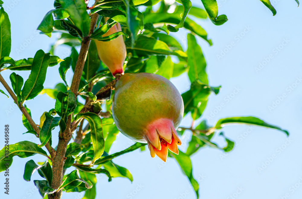 Pomegranates, a beautiful pomegranate tree with beautiful fruits in Brazil, natural light, selective focus.