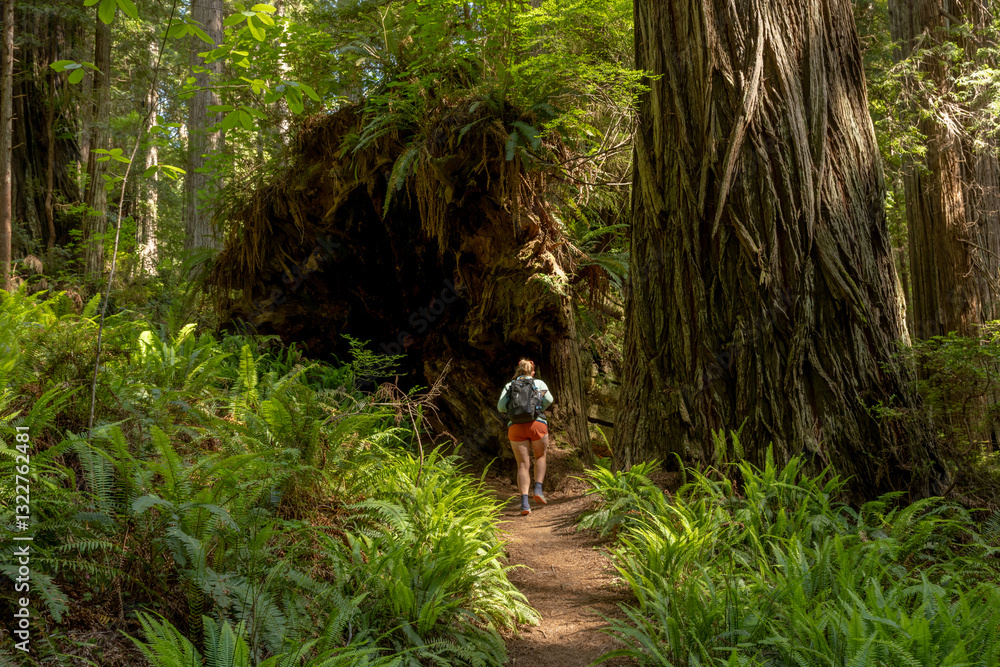 Hiker Climbs Small Hill Toward The Giant Redwood Trees In Redwood