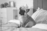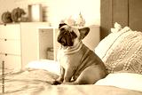 Cute French bulldog sitting on bed in bedroom with autumn decorations