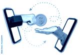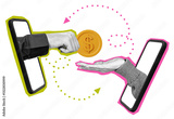 Hands emerging from smartphones exchanging a coin, symbolizing online transactions. Abstract collage style on a white background. Concept of digital payments